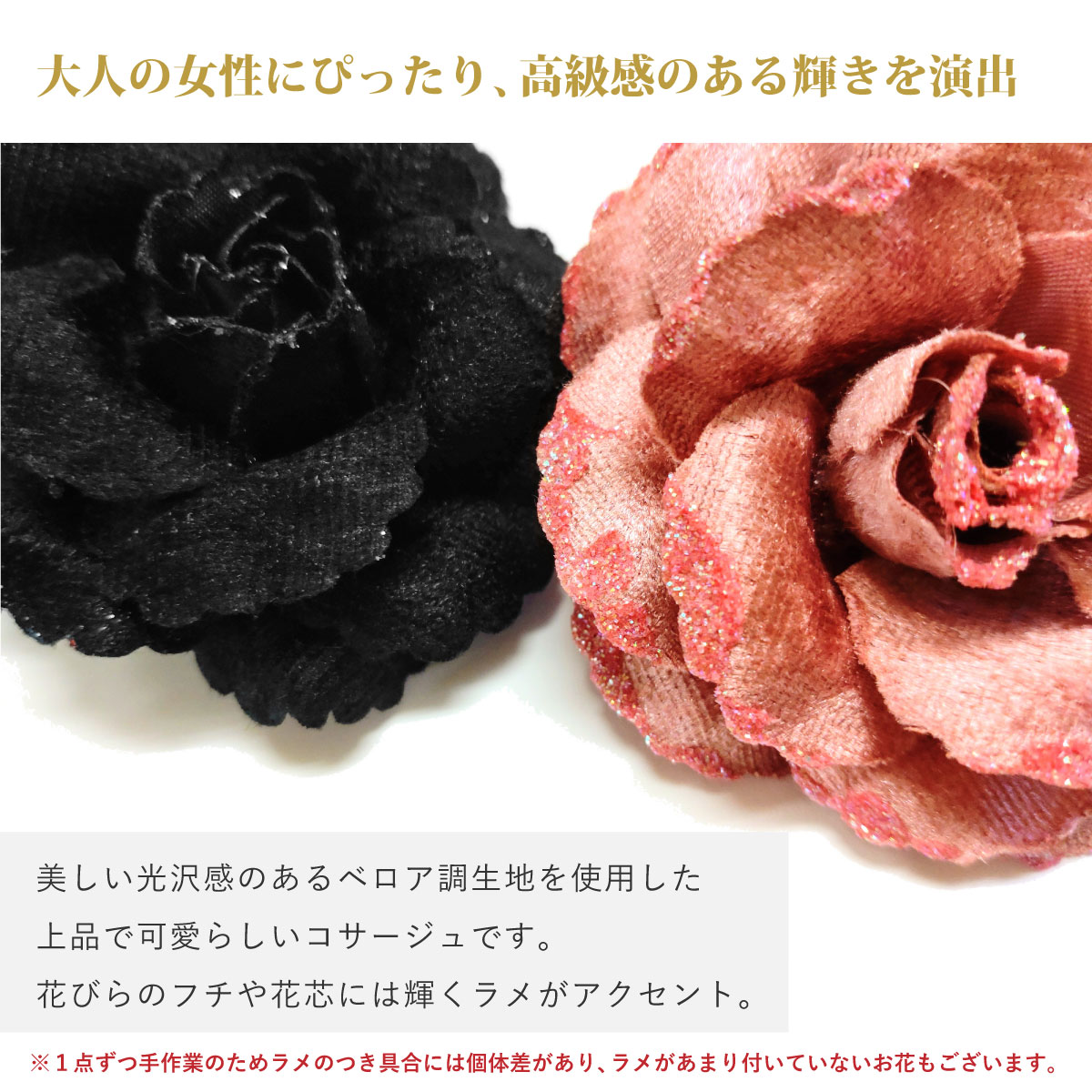 ※花びらには光沢感のベロア調生地を使用しています。 ※1点ずつ手作業のため、お花の形・ラメのつき具合などは個体差がございます。あらかじめご了承ください。 |