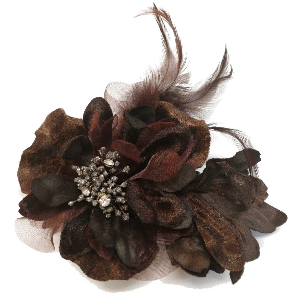 ベロア コサージュ 花芯 ラインストーン&羽根つき ブラウン 6u-4 フォーマル レディース 卒業式 入学式 結婚式 お洒落 爆買
