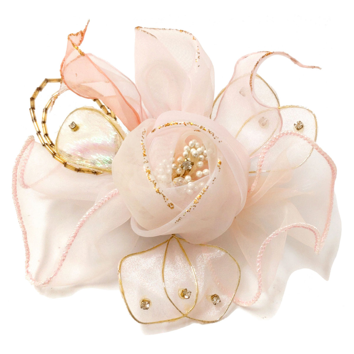 柔らかなレース風のオーガンジー・まるで流れるようなデザインの煌びやかなコサージュ