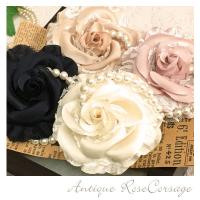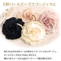 約0.8cmの大きめラインパールが目を惹く、ゴージャスなコサージュです。 オールドローズのような丸い花びらとレース重ねがアンティーク感を漂わせます。