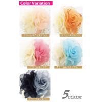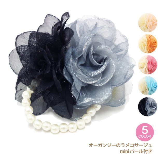 透明感のあるオーガンジーの花びらと、輝くラメの美しいコサージュ。