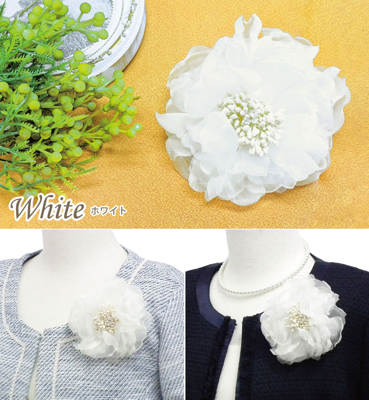 裏面は安全ピンと便利なくちばし状のクリップ付き。 スーツやドレスだけでなく、髪飾り・バッグなどの小物にもおしゃれのアクセントして使えるアイテムです。 |