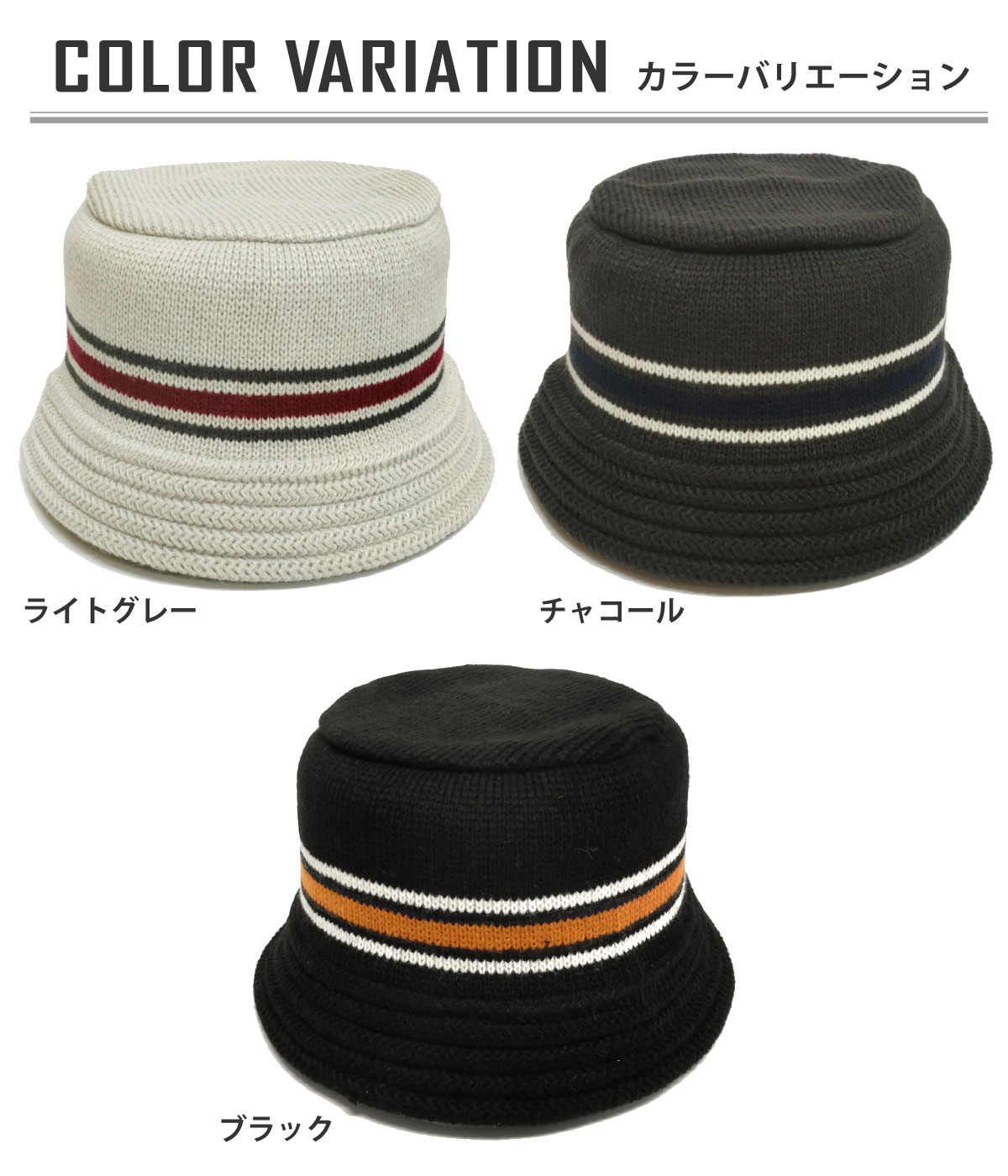 | 品名 | スポーティなライン柄 ニット バケハ風 ハット 帽子 バケットハット ゴム編み アクセントカラー KNIT HAT ぼうし クロシェ |