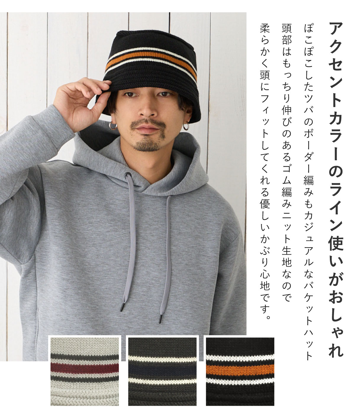 アクセントカラーのライン使いがオシャレ! ぽこぽことしたツバのボーダー編みもカジュアルなバケットハットです。