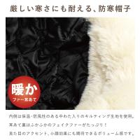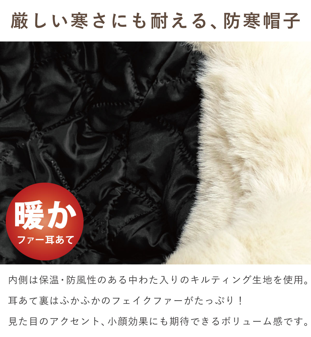 帽子の内側は中わた入りのキルティング生地なので、風を通さず頭やお顔周りを暖かく包みます。 耳あて裏はふかふかの手触りが気持ちいいフェイクファーがたっぷり! やさしいホワイトベージュ色のファーは見た目のアクセントにもなり、小顔効果にも期待できるボリューム感です。