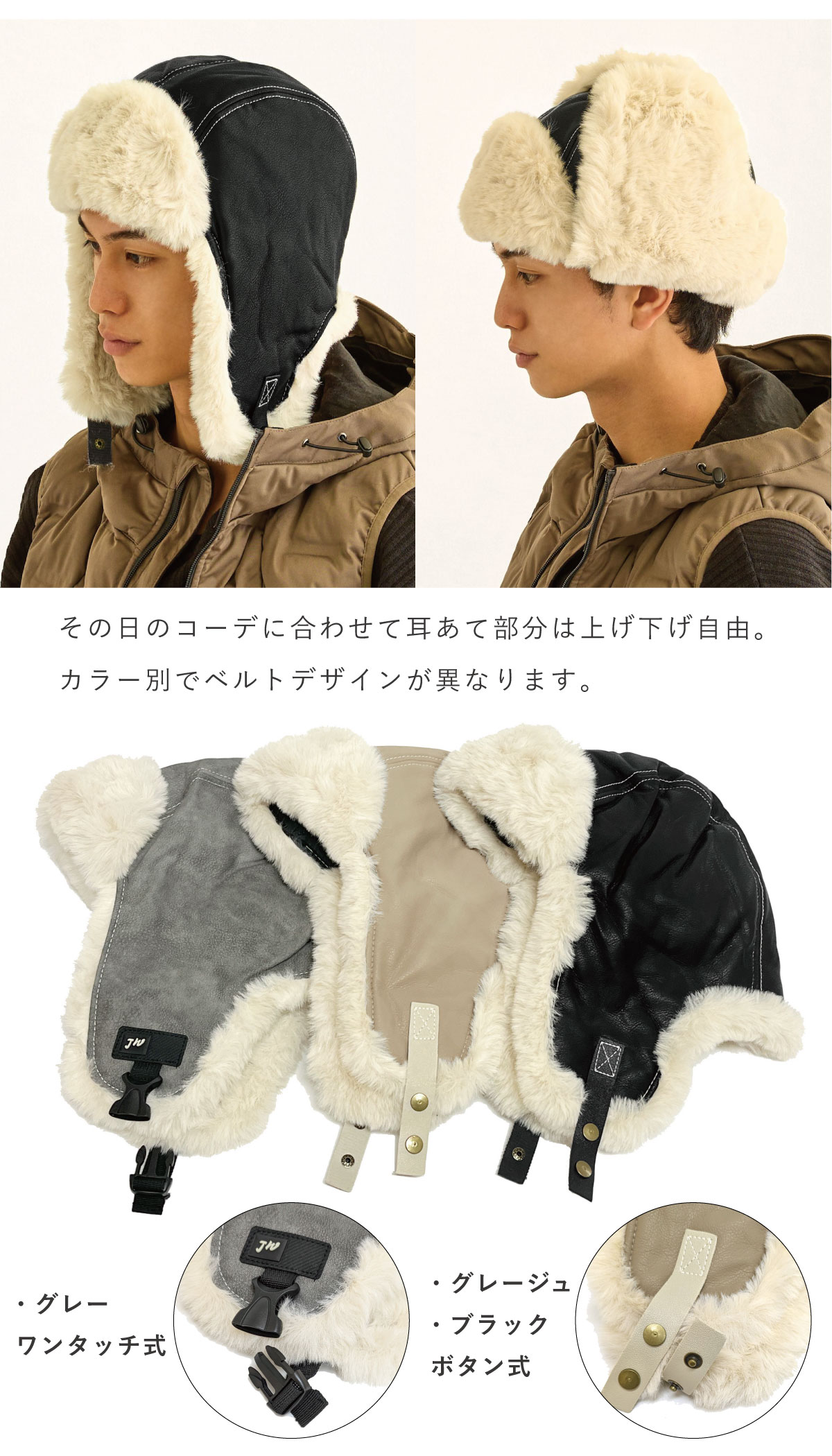 耳あてはそのまま被れば寒さ対策に、ベルトを留めて上げればロシア帽スタイルに
