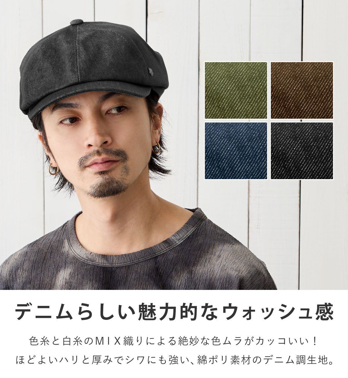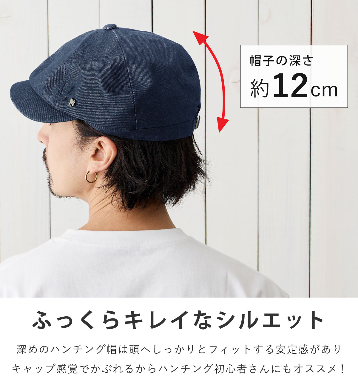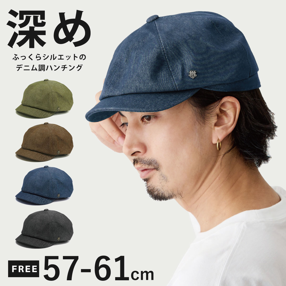 品名 | デニム調 ハンチング 深め ハンチング帽 ふっくらキレイなシルエット MQUM ピンズ付 サイズ調節 57-61cm ニュースボーイ キャップ ぼうし | |