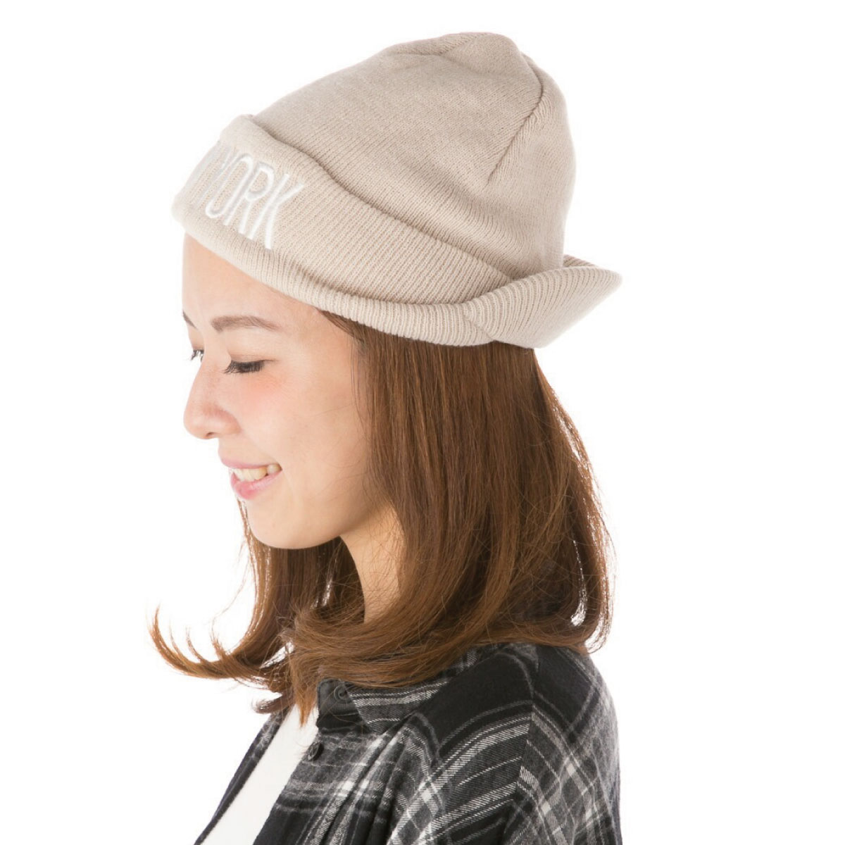 シンプルなショートタイプのニット帽に逆さまつばが付いた大胆デザイン!