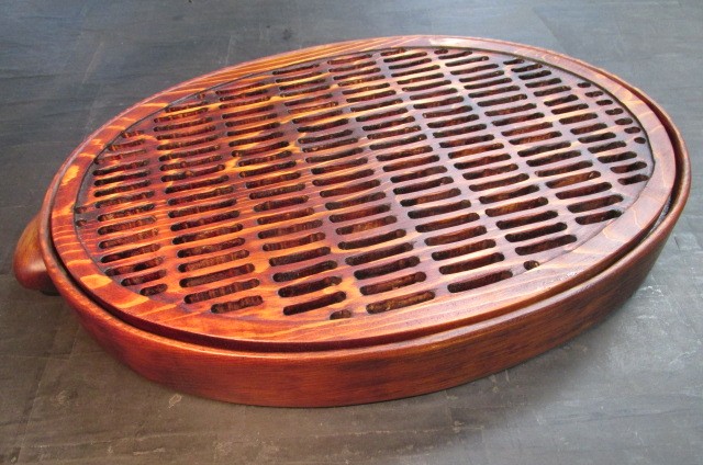 杉の3大産地として有名な吉野杉を使ってくり抜きで中国茶を入れるときに使う茶盤を作り、お湯が漏れないように作った入れ物の上に又吉野杉を使ってスノコ状に彫り出したサンをはめ込んで茶盤を完成させました。仕上げには漆を使い拭き漆技法で仕上げました。材料:吉野杉仕上げ:拭き漆技法サイズ:41,5cmx26,5cmx5cm深さ:2,5cm 「木匠」 溝端 隆 作