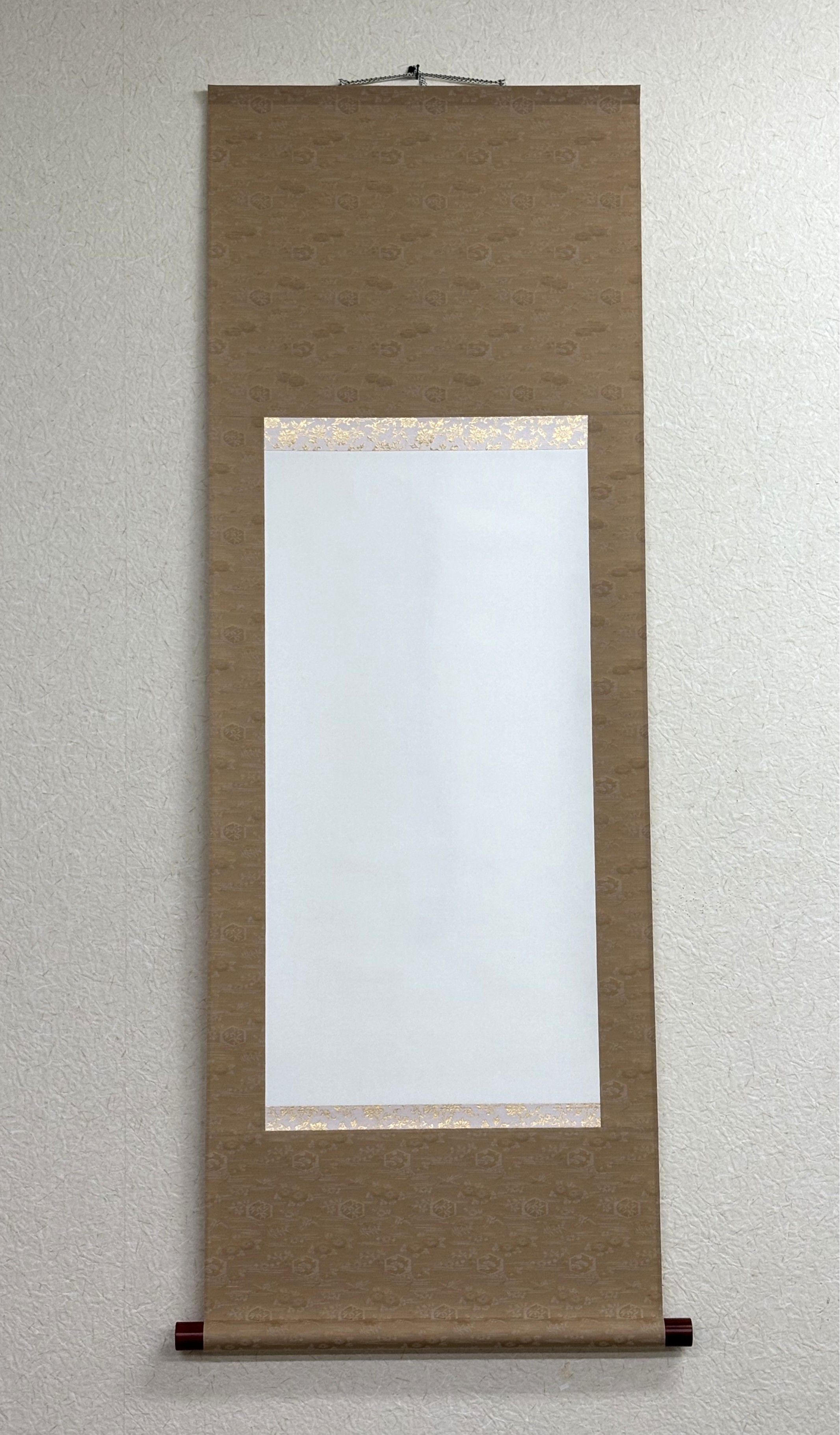 無地軸 白抜き掛軸 【半切1/2】 丸表装 HM-2-11 薄オレンジ・茶系 鶴松竹柄 白紙 画仙紙 和紙 書道用品 書道 日本画 水墨画 展示 展覧会