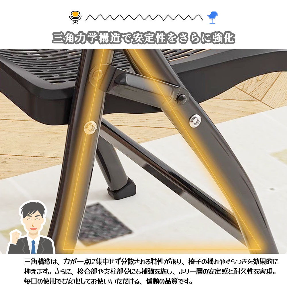 高品質素材:座面と背もたれには耐久性のあるプラスチック素材を使用し、通気孔デザインで快適さと通気性を高めています。フレームは頑丈な金属パイプ製で、安定感と耐久性があります。