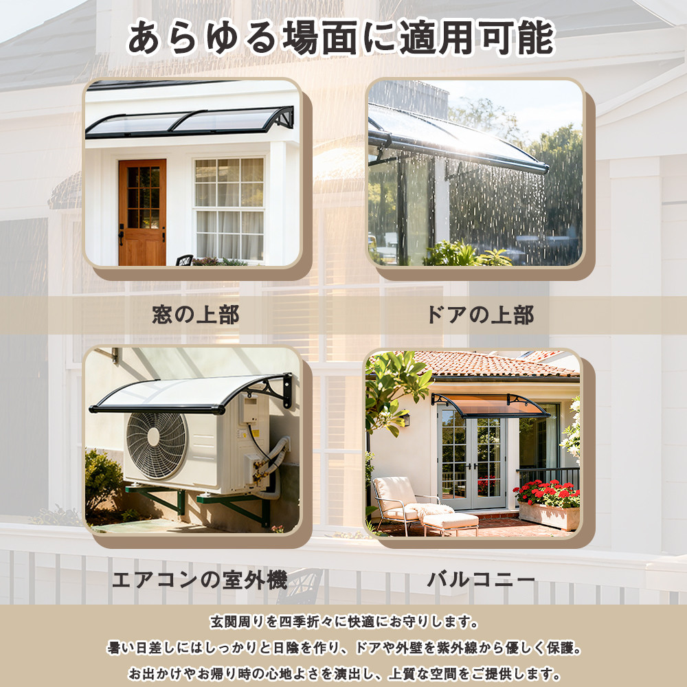 窓の上部 ドアの上部 エアコンの室外機 バルコニー 玄関周りを四季折々に快適にお守りします。暑い日差しにはしっかりと日陰を作り、ドアや外壁を紫外線から優しく保護。