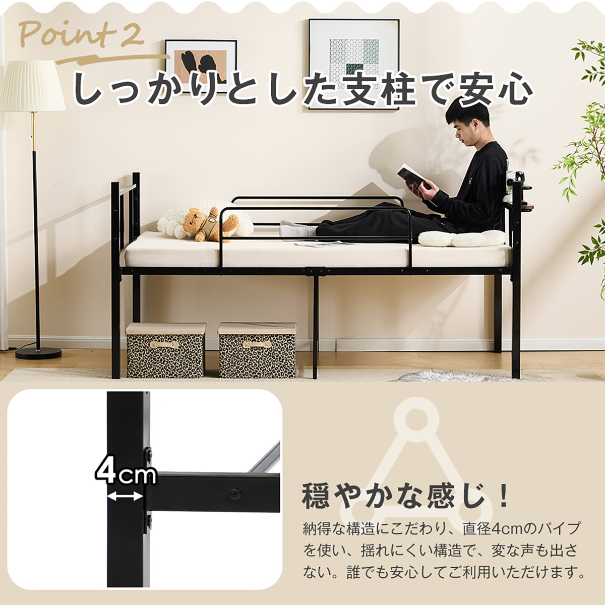 ベッド面の耐荷重は約120KG 頑丈なパイプが安全性を確保、そのうえ、通気性がよくカビが発生にくい。