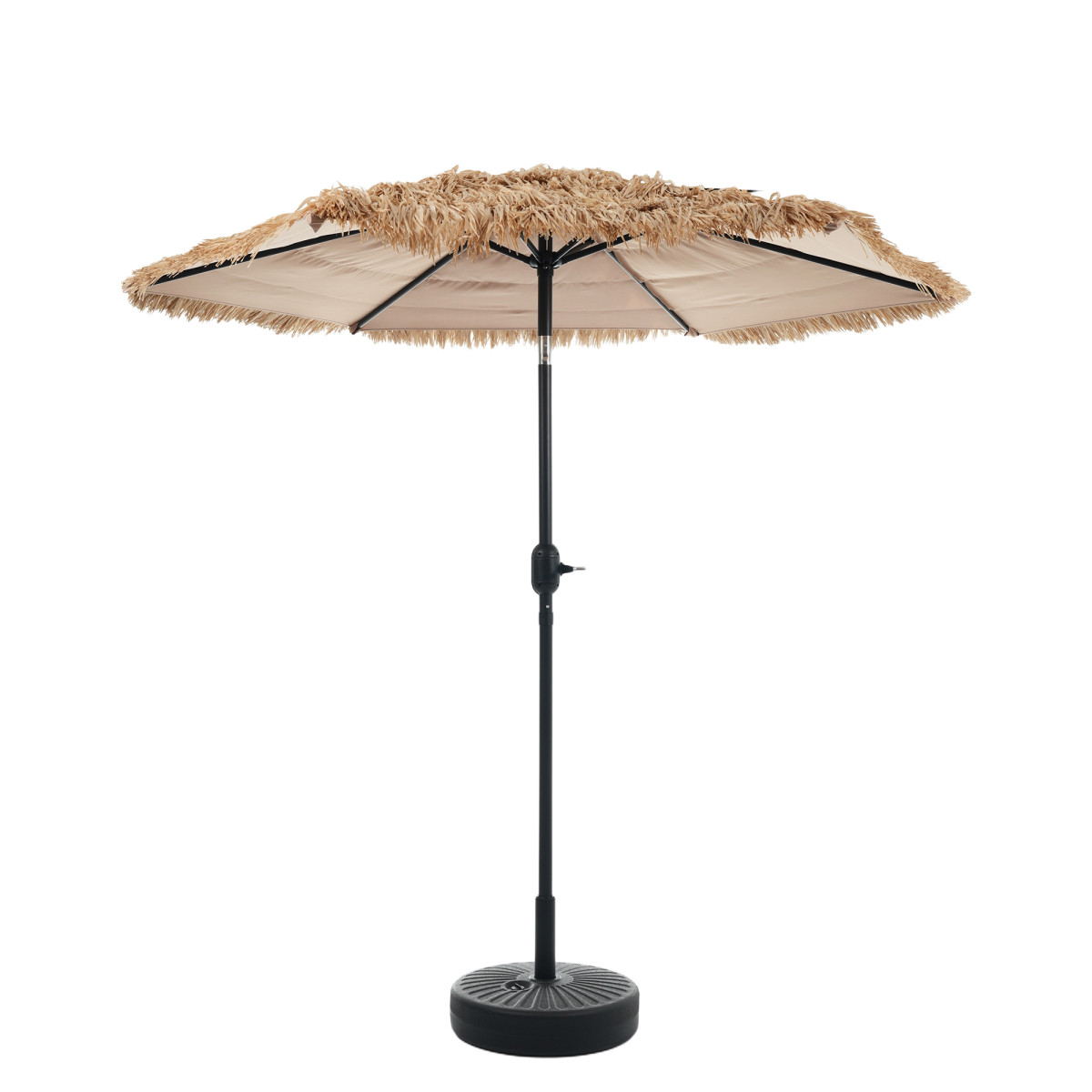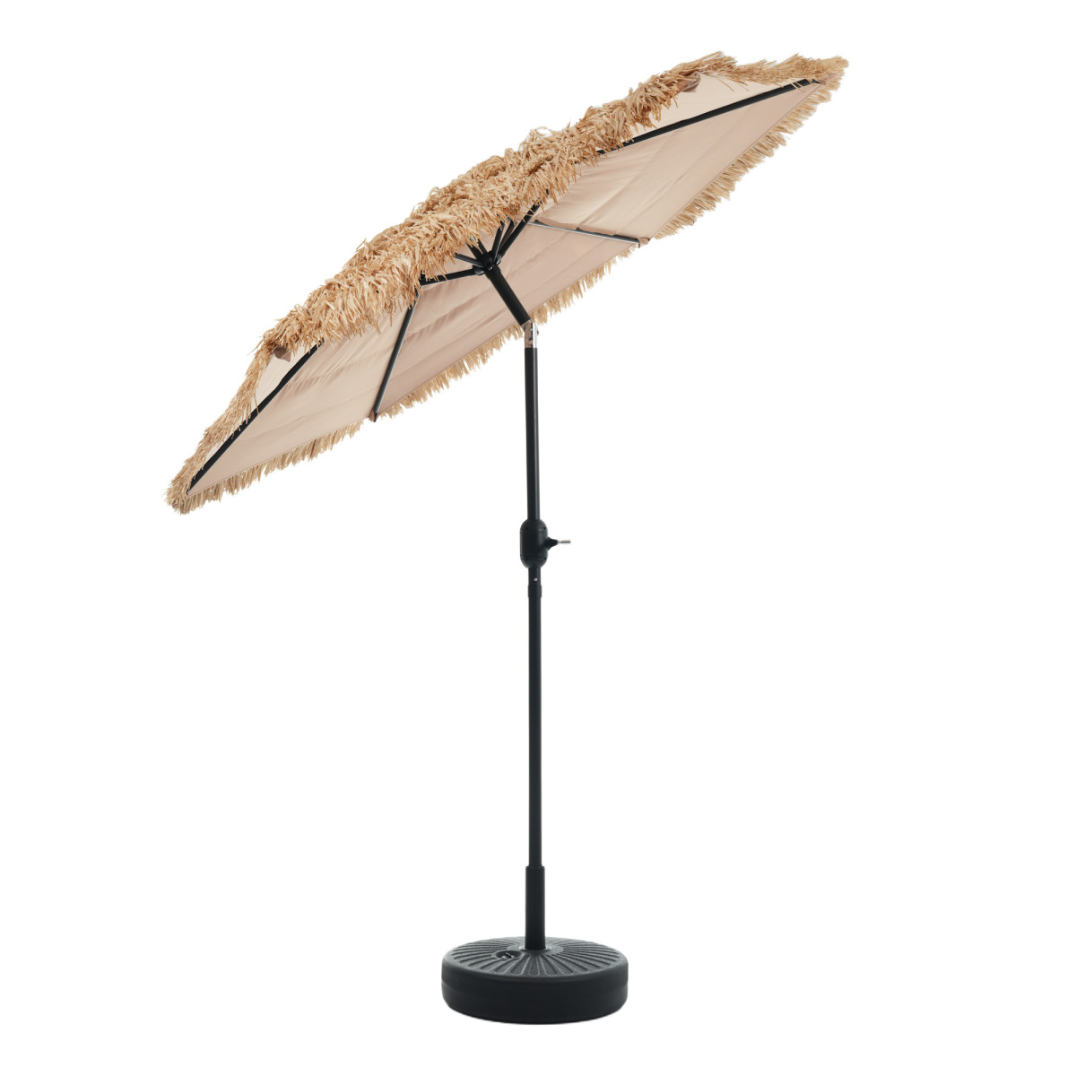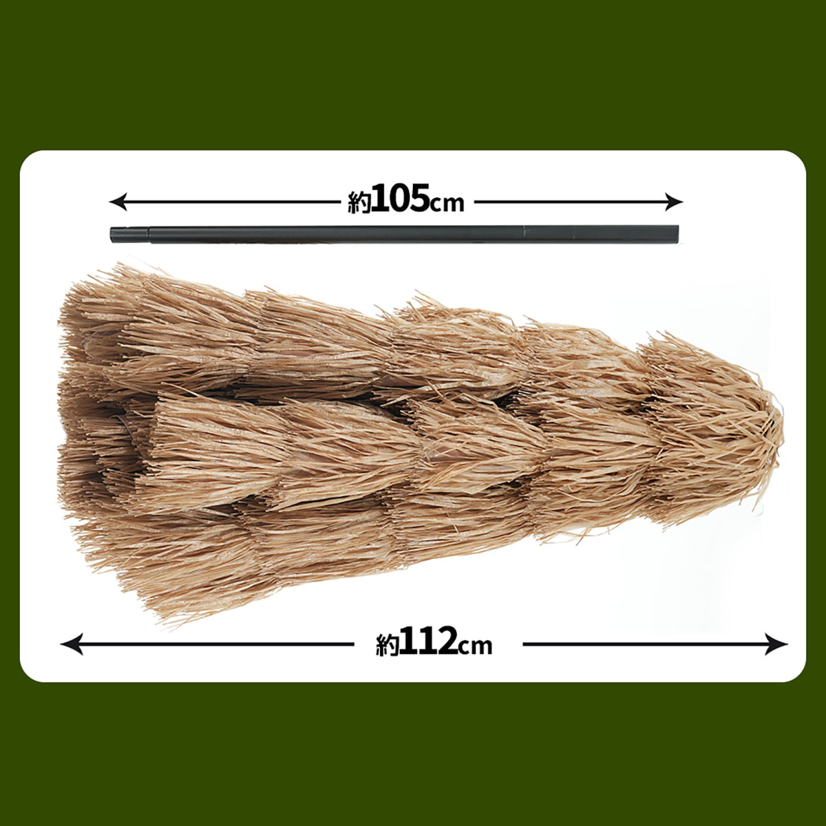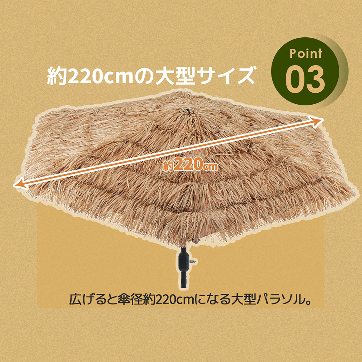 傘生地にはUVカット加工を施してあるので紫外線をしっかりと防ぎます。 30+UPF わら調 PE 素材を採用 自然の風合いを持ちながら耐久性に優れ、手入れも簡単です。 急な雨でもしっかりと水を弾く安心の撥水加工 お庭やバルコニーでのひとときを、どんな天候でも楽しむことができます。※完全防水ではありません。