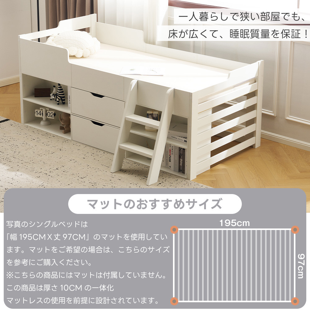 写真のシングルベッドは「幅195CMx丈97CM」のマットを使用しています。