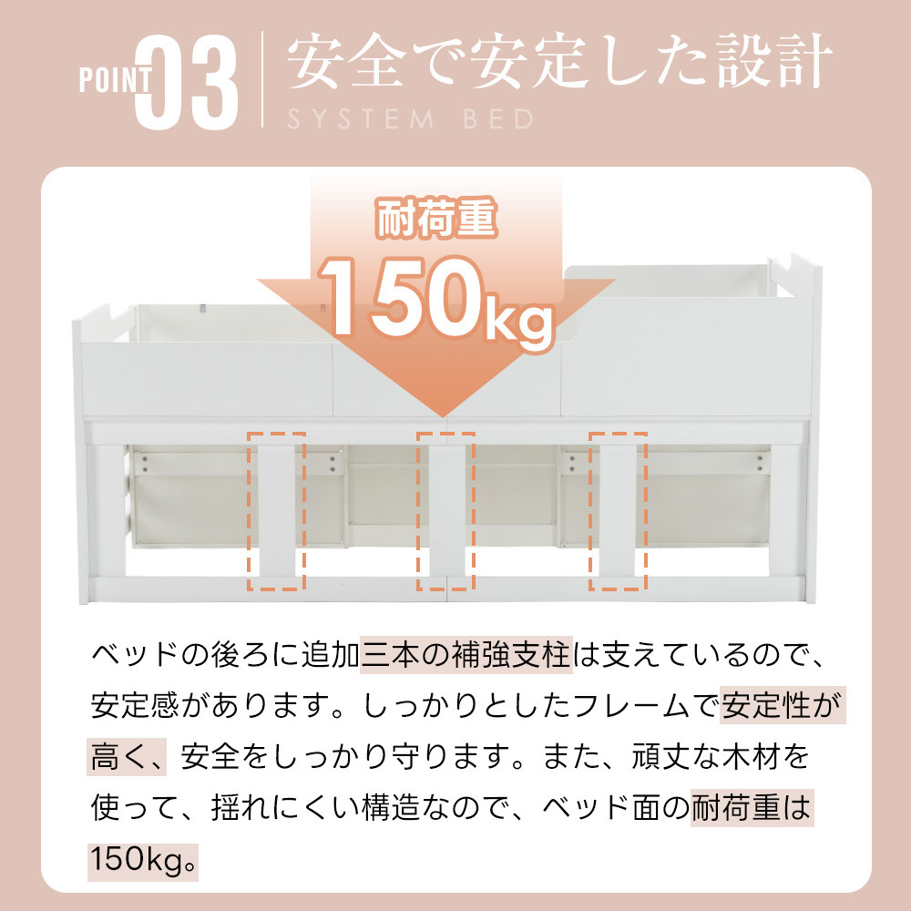 ベッドの後ろに追加三本の補強支柱は支えているので、安定感があります。