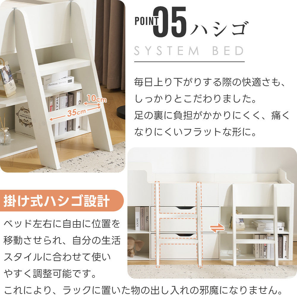 夜間も安心して眠れる適度な高さ設計で、出入りもスムーズ。全ての角を面取りすることで、