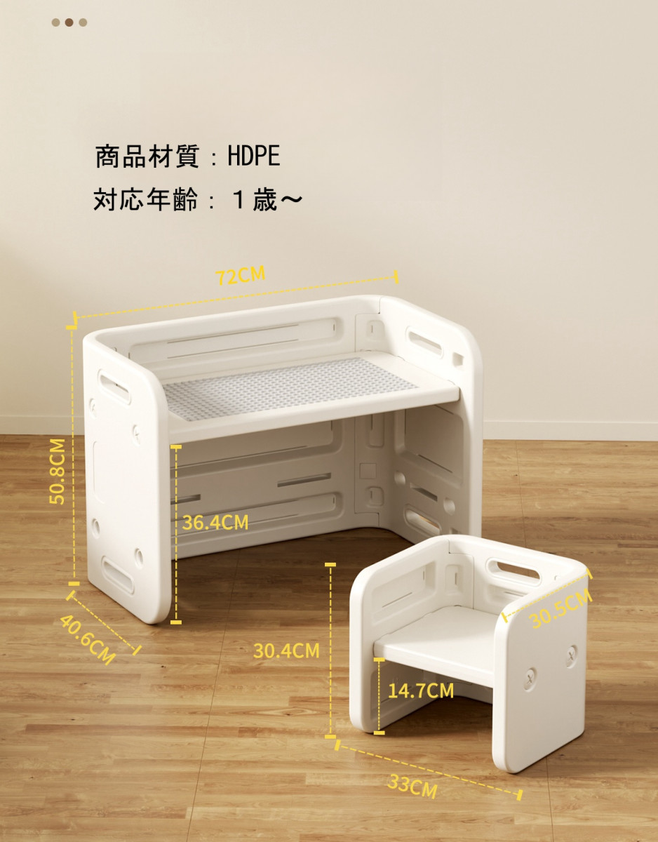 大人でも使えるしっかりの耐荷重、角丸設計、地球と子供に優しいHDPE素材、組立簡単