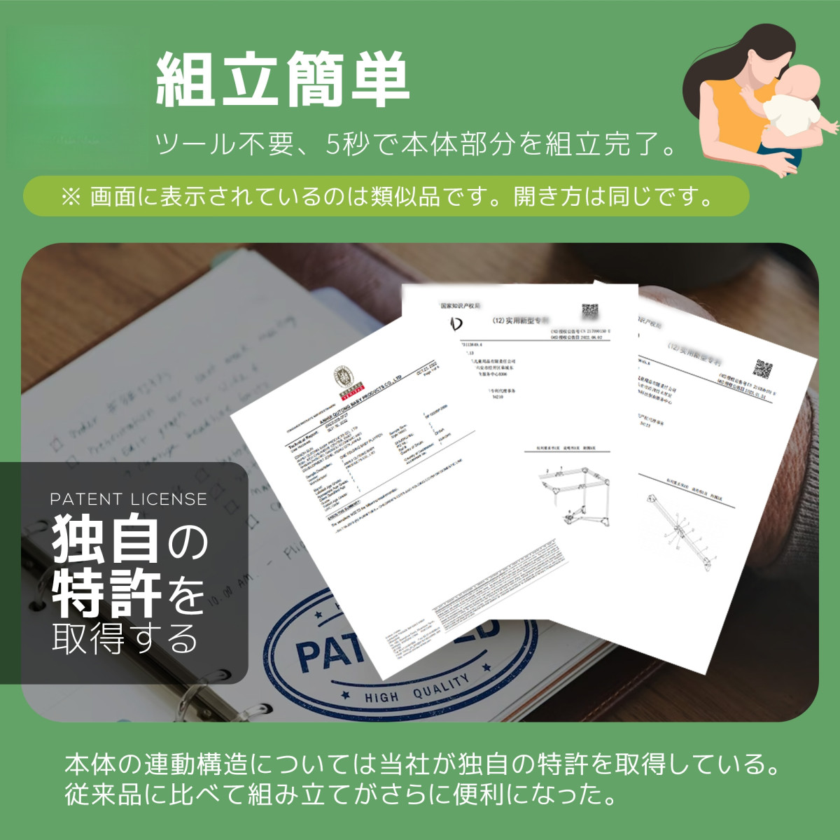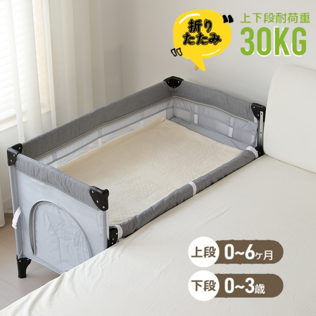 マットレスを下段に取り付けるとベビーサークルになります。通気性と可視性の良いメッシュ素材を採用して、お子様の様子をしかり見えます 。本体の連動構造については当社が独自の特許を取得している。 従来品に比べて組み立てがさらに便利になった。