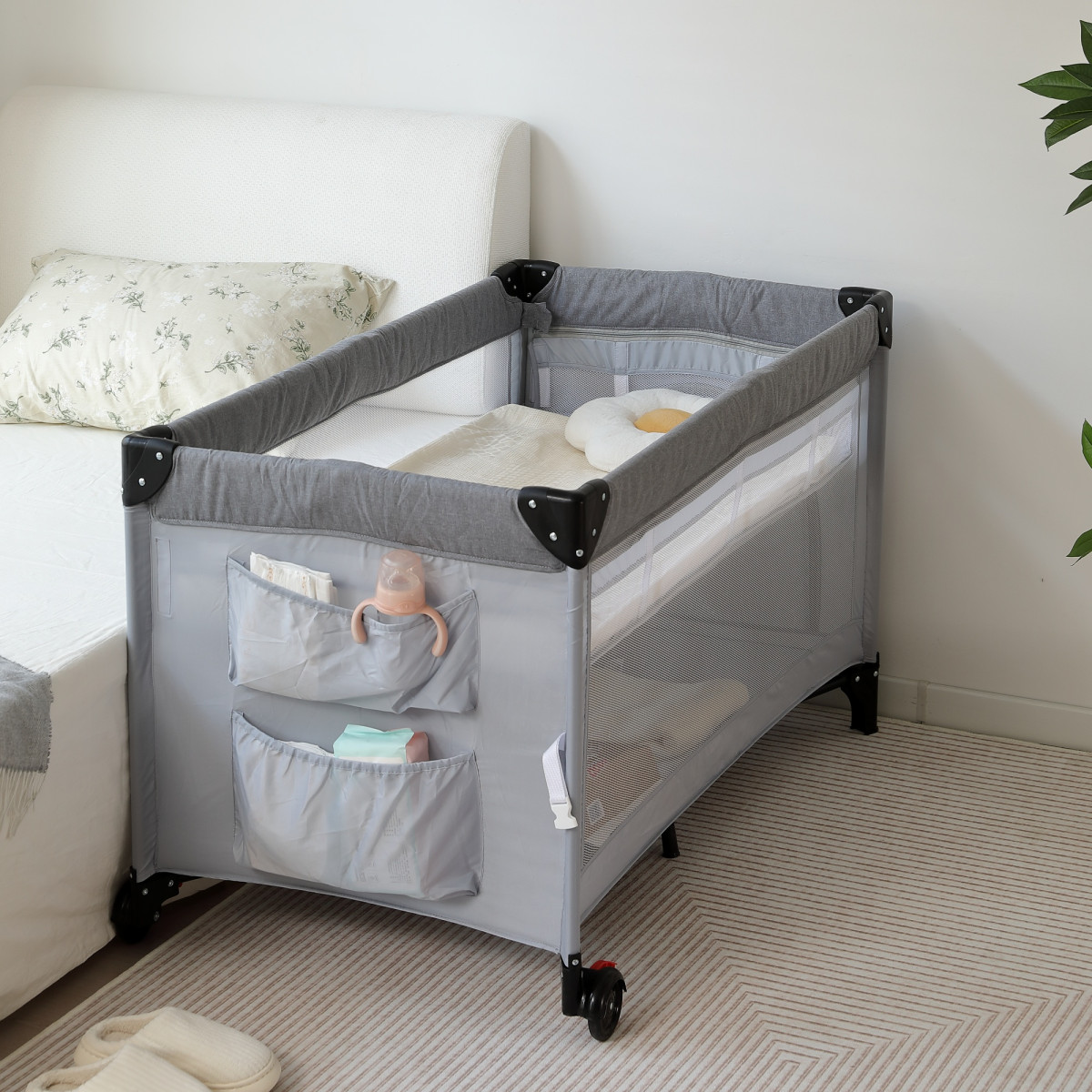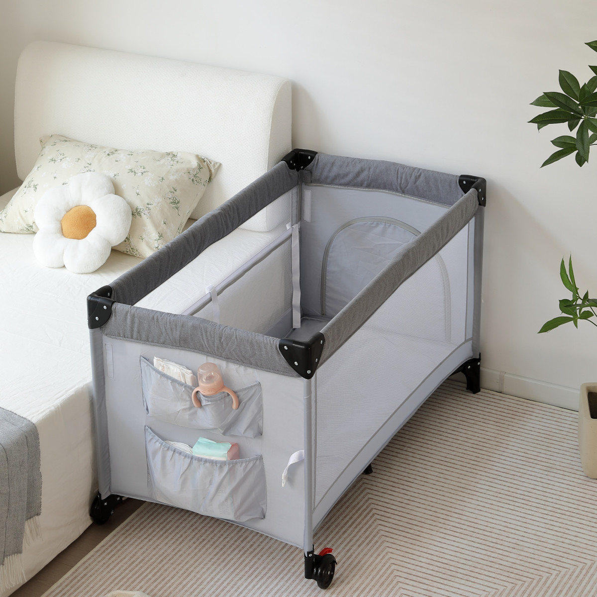 ベビーサークル キャスター付き 片サイド高さ調整可能 折りたたみ 添い寝 プレイヤード お昼寝マット キャリーバッグ付 マットレス付 多機能 ベビーサークル