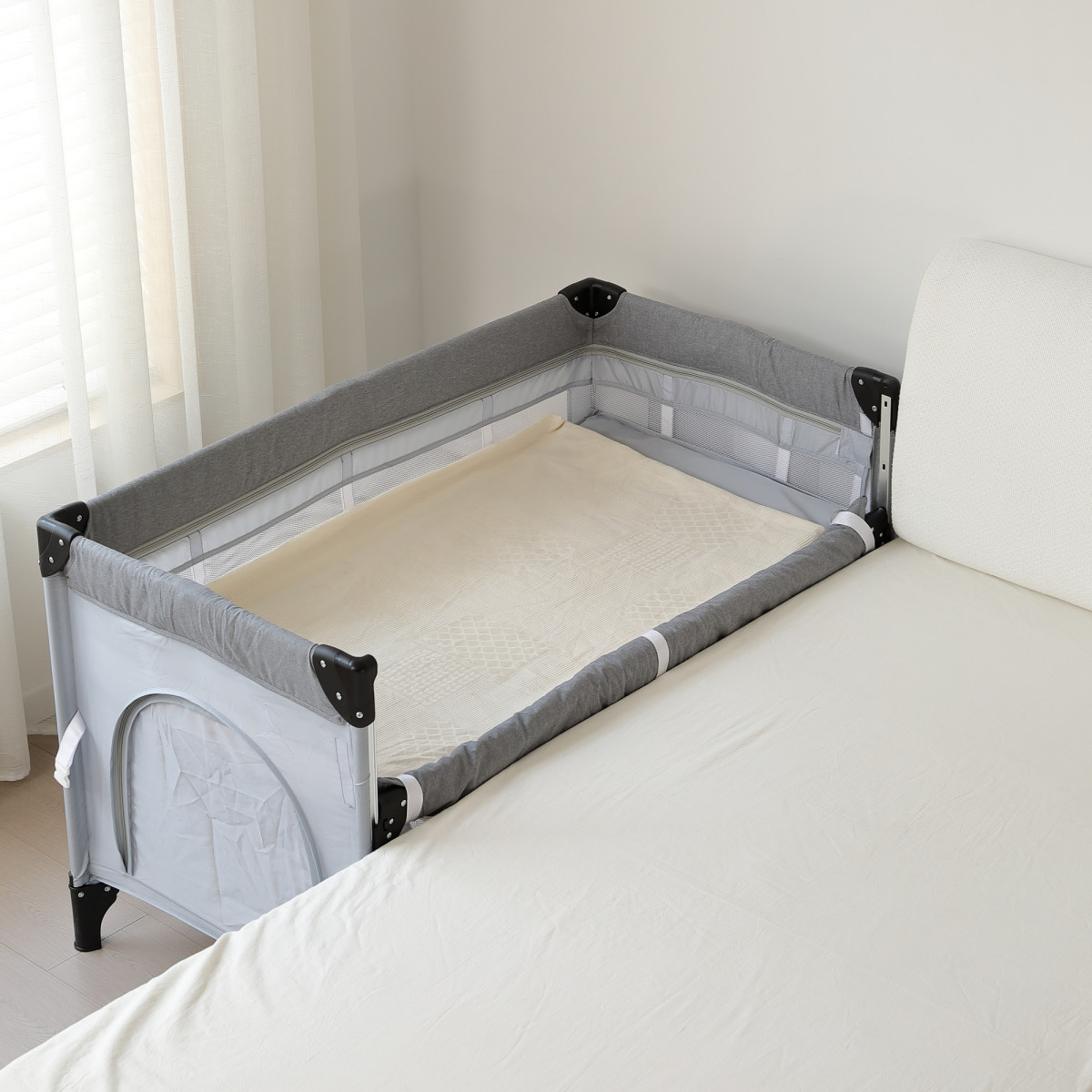 お子様の出入りに便利なファスナー式扉は、収納スペースとしてもらくらく!側面バックはお子様のおもちゃやおむつなどを収納できます。