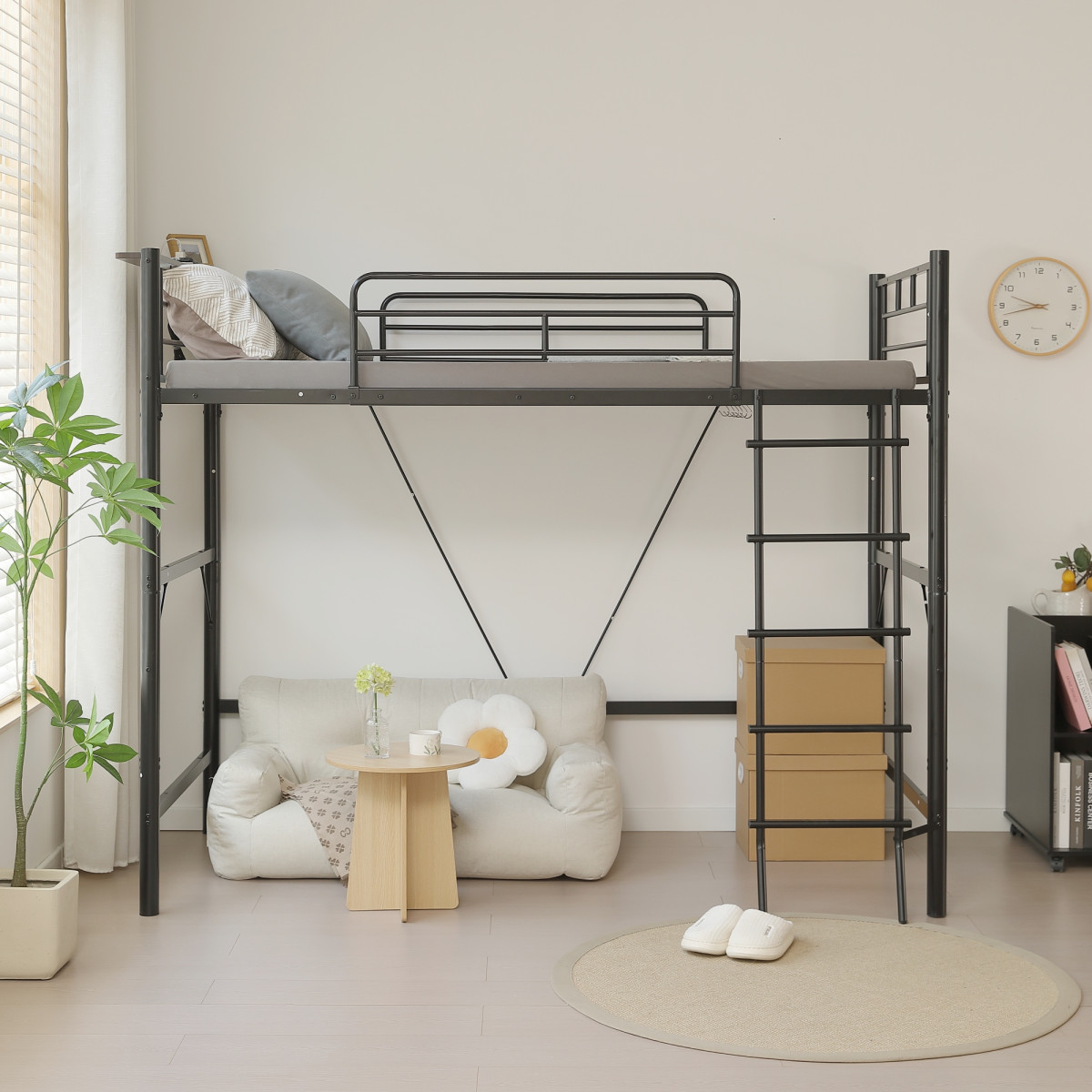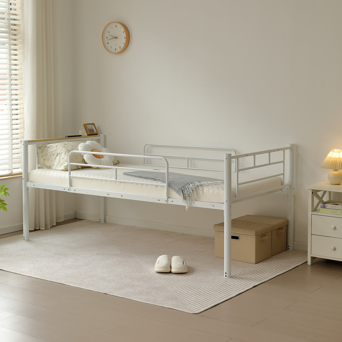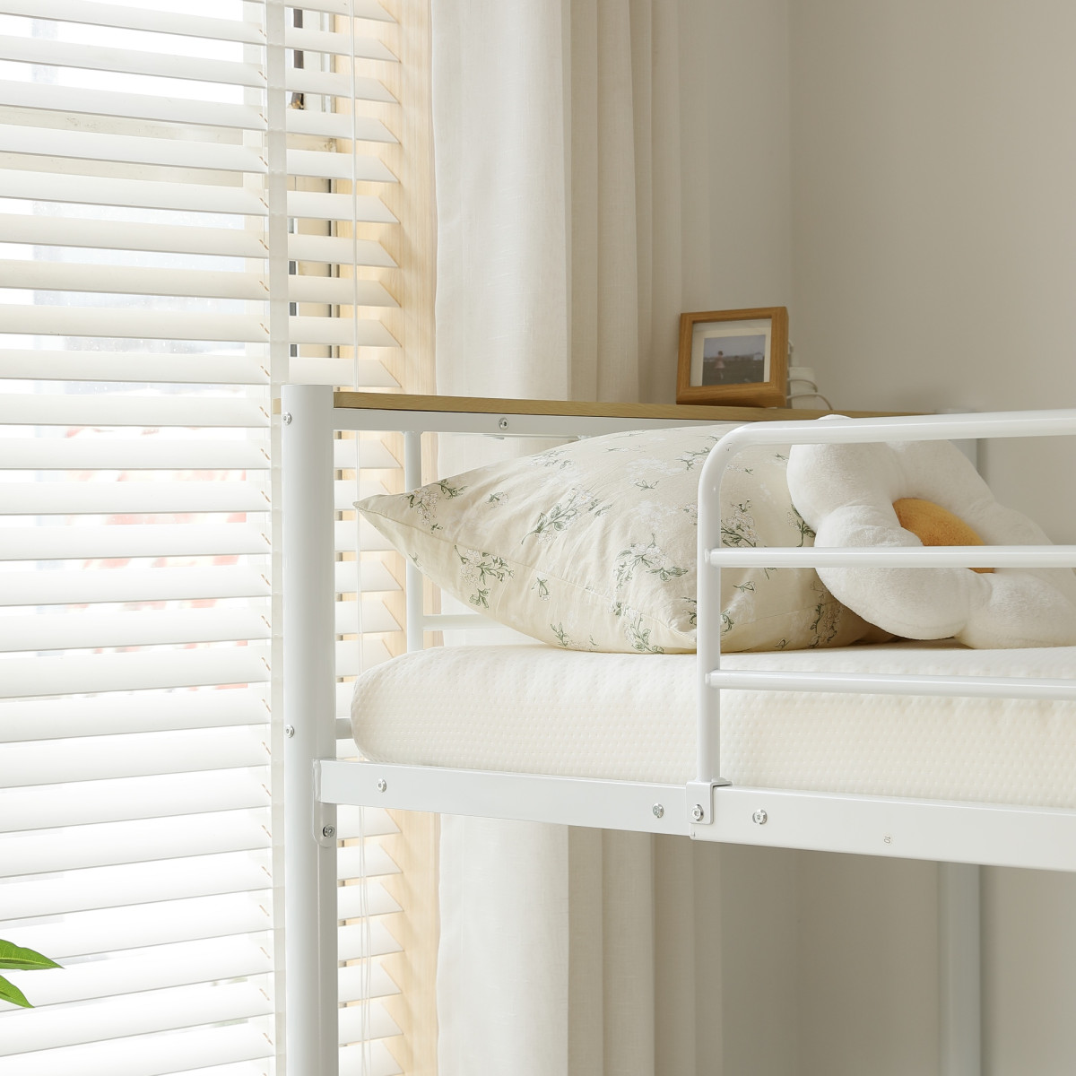1 側面で支えてずり落ちを防し上段には、睡眠中の転落を防ぐサイドフレームが付いています、布団のずり落ちや寝返りを支えてくれます。