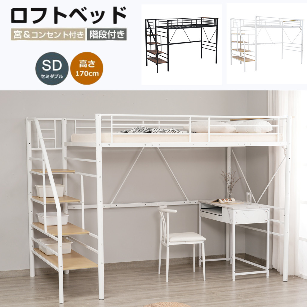 ロフトベッド ハイタイプ 階段付き ハイベッド SD セミダブル シングルコンセント 宮付き システムベッド 収納 耐震 パイプベッド ロフト システムベット 爆買