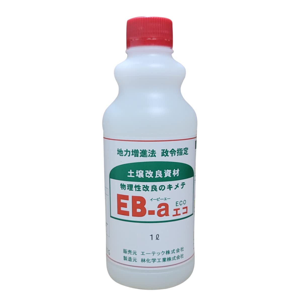 〓地力増進法 政令指定土壌改良資材〓<br> 「EB-aエコ」は、電荷の作用によってあらゆる種類の土壌を瞬間的に耐水性団粒とし、無数の毛管、非毛管の孔げきをもつ膨軟な土壌構造を形成します。<br> したがって、土壌の透水性・通気性・保水性・保肥性・膨軟性を著しく増加します。<br>結果として、優れた発根作用で根張りを促進、土壌の流出・ベト付きを防止し、作物の耐病性を増加します。<br><br> 500〜1000倍で使用します。原液1リットルで30坪を目安にご利用ください。<br>根圏の土壌まで確実にいきわたるように、たっぷりと施用してください。<br>土壌がある程度湿り気を持っているときや降雨時・降雨後の使用は、浸透しやすく、効率的に土壌改良が行えます。<br><br>※EB-aエコの商品パッケージが変更になりました。