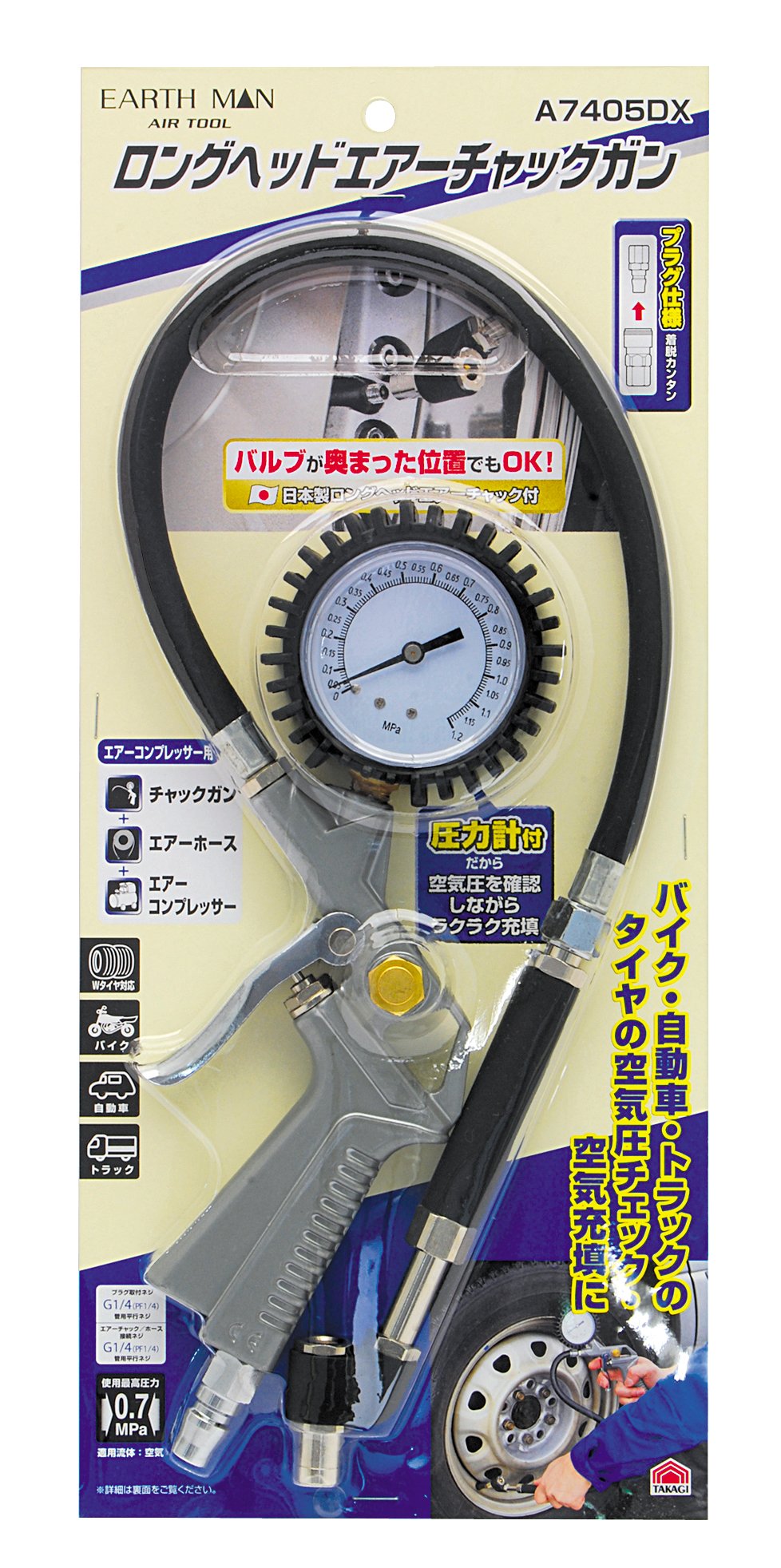 商品名:高儀 エアーチャックガン ロングヘッド A7405DX EARTH MAN 空気圧の確認 圧力計付き 空気入れ 奥まった位置にあるバルブでもOK ダブルタイヤ対応 プラグ仕様 エアーツール たかぎ