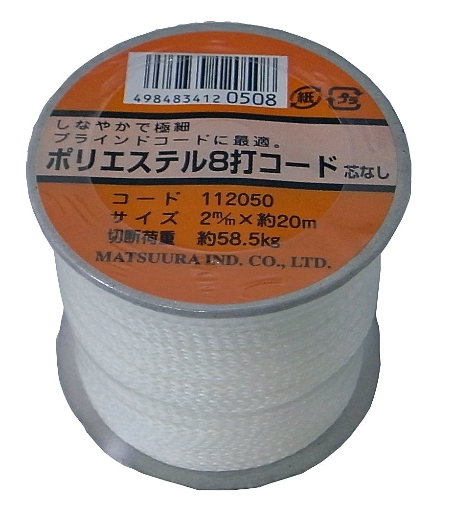 まつうら工業 ポリエステル製 8打コード 芯なし 太さ約2mm 長さ20m 白 ボビン巻