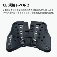 水よりも比重の軽いポリプロピレン樹脂を、特殊成形技術によって成型したハニカムコア材『TECCELL(テクセル)』を採用。厚さ17mm、重量約250gを実現し2層のテクセルを交互に嵌合させる構造により、prEN1621-3 level2(セパレートチェストDCタイプ)をアジアのメーカーでは初めてクリア。また、セパレートタイプのプロテクターにおいて世界最高の剛性を実現しました。左右2分割構造により、ジャケットを脱ぎ着する都度にボタンを着脱する必要は無く、休憩時にジャケットのファスナーを下ろした際もプロテクターの存在が気にな