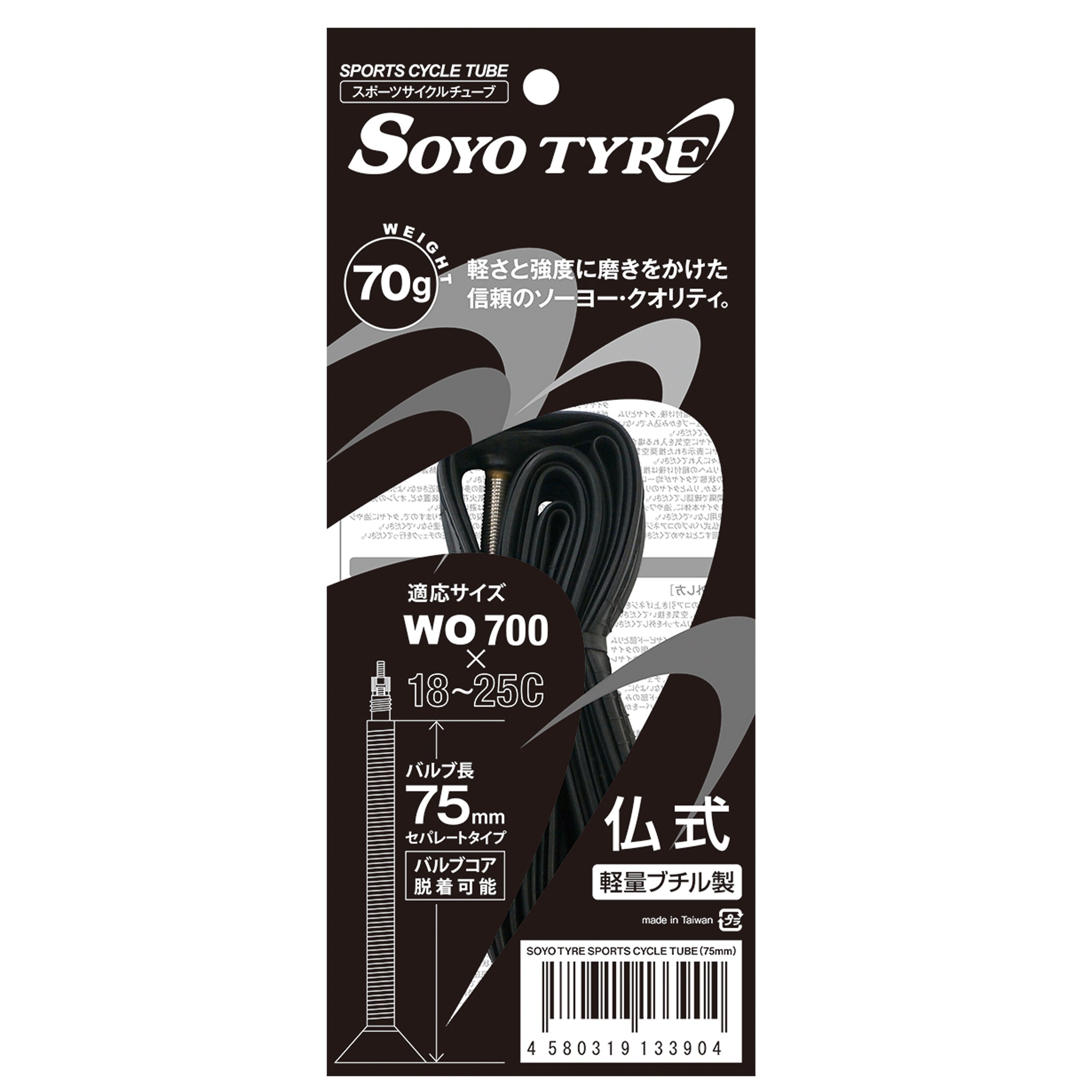 【商品名】 SOYO WOチューブ 700x18~25C FV75mm 【サイズ】 700×18?25c 【重量】 70g 【バルブ】 仏式75mm 【チューブ】 ブチル