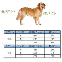 材質:ポリエステル [S]前足:幅14cm 胸回り55cm 後足:幅28cm 胸回り48cm 適用犬の体重:15-20kg [M]前足:幅22cm 胸回り62cm 後足:幅34cm 胸回り60cm 適用犬の体重:28-35kg [L]前足:幅25cm 胸回り74cm 後足:幅39cm 胸回り68cm 適用犬の体重:38-45kg