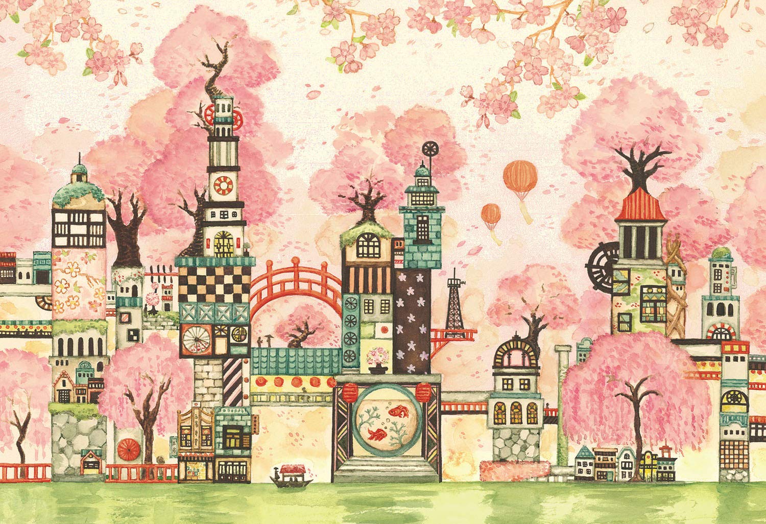 透明水彩を使用して描かれた遊びあふれる空想の街は、独特の世界観で人々の心をワクワクさせてくれます。