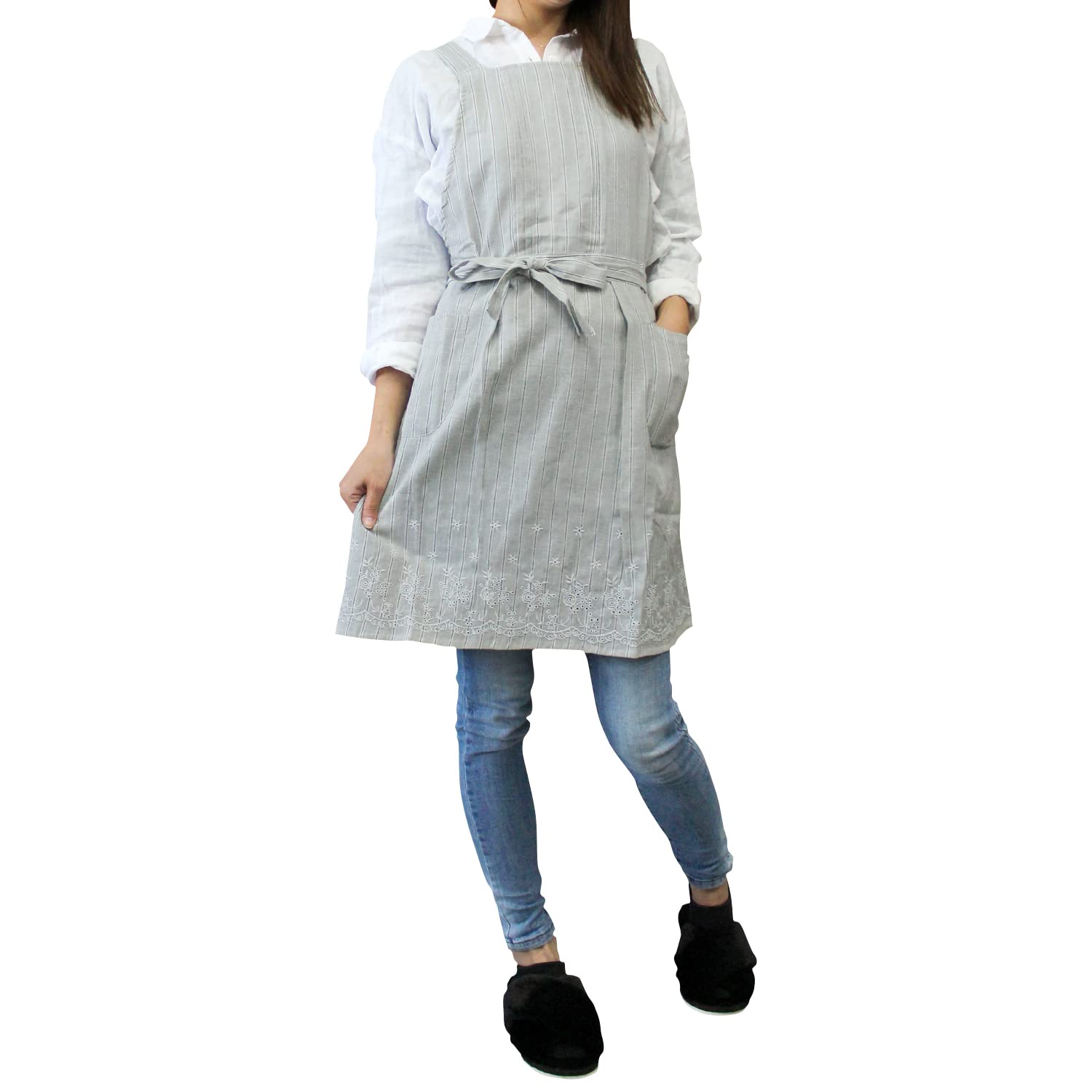 飛馬日本 麻入りストライプすそ刺繍使いバッククロスエプロン GY M~L
