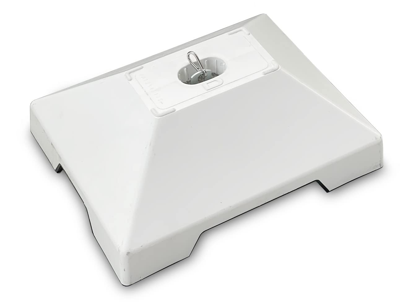 20kgの重量があり、どっしり重いコンクリートウエイトです。外側はプラスチック、内部はコンクリートが充填されており、重心の低い台形で安定感抜群。日除けのシートや垂れ幕、グリーンカーテンなどが風であおられてもズレにくく、しっかり支えます。庭先のオーニングシート、寒冷紗、店頭の大型垂れ幕、ブルーシートの固定などに。3.2mm厚の丈夫な金具を使用し、屋外の風雨に耐える丈夫な設計です。強風時の撤去や店舗での日常的な着脱作業に便利なステンレス製カラビナを付属。底の4面に手が入る手掛けスペースがあるため、移動や位置調整が手軽です。