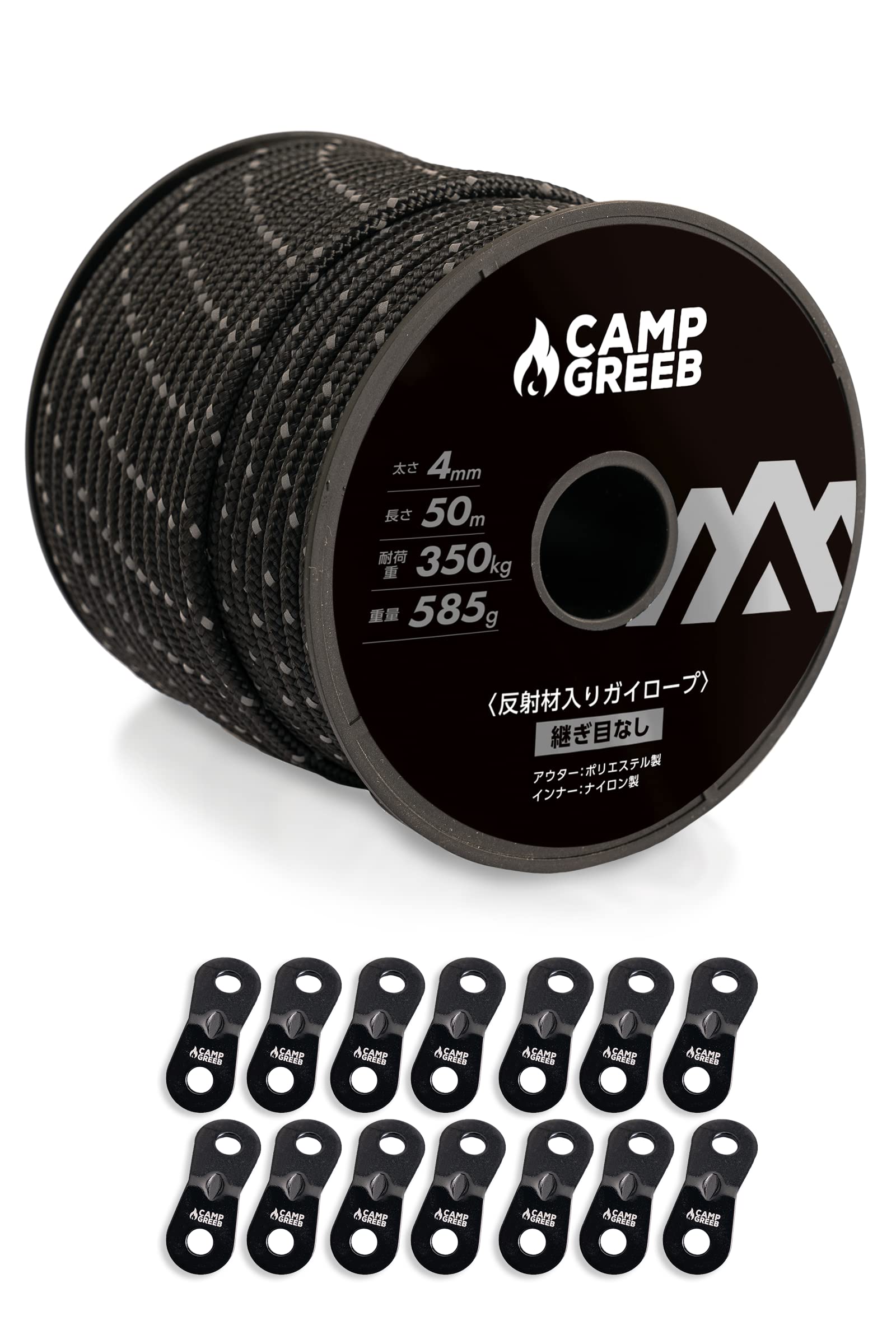 商品名:キャンプグリーブ 反射材入りパラコード 3mm/4mm/5mm ガイロープ 30m/50m巻 耐荷重240kg/350kg/420kg 自在金具12個付 継ぎ目なしノーカット テントロープ キャンプ (50, ブラック/4mm)