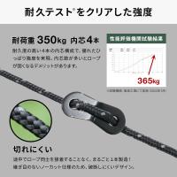 世界20ヵ国以上で販売されているロープ専門工場と共同開発。太陽光・風雨・温度変化に強いポリエステルと、伸縮強度の高いナイロンを合わせることで、屋外利用に必要な耐久性を高めました。また、内芯数を適切な数に調整することで、ロープを張る際のしなりとアウトドアに求められる軽量化にも対応。グランドシートの固定や、ワンポールテント・TCタープの設営に最適なキャンプ用品です。付属の自在金具を使って自由に長さを調節できるため、ペグダウンも簡単。 リールと金具はスタイリッシュなブラックギアで、アウトドアの景観や雰囲気を壊さないデザイン。ロープはライトで光る反射材が含まれているため、夜間で