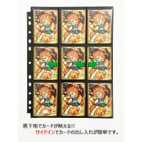「カードが映えるブラックの下地でコレクションに最適」「下地があるから裏側(反対側)のカードが干渉しない」 「高い透明度のポケットでカードがきれいに見える」「カードが出し入れしやすく、落ちにくいサイドインポケット」 ポケットサイズ H94mm×W67mm 本体素材:PP 11穴(2・3・4穴兼用) ポケット数 表9面(3×3)・裏9面(3×3)