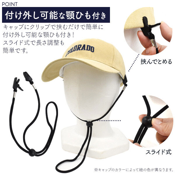 キャップにクリップで挟むだけで簡単に付け外し可能な顎ひも付き!