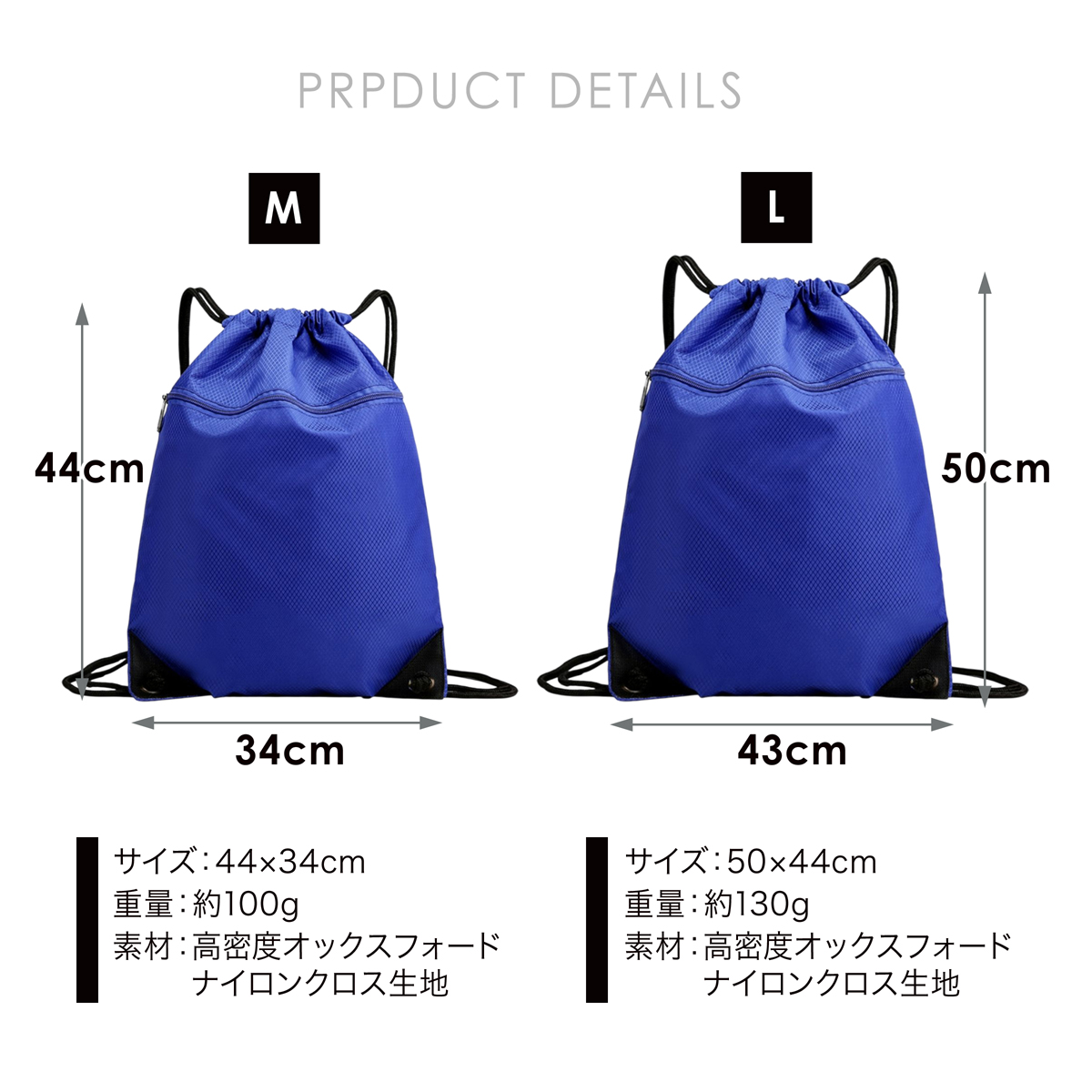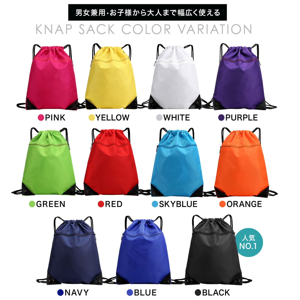 プールバッグ・体操着袋・シューズ入れ・ジムバッグなど多用途に使える定番ナップサック。