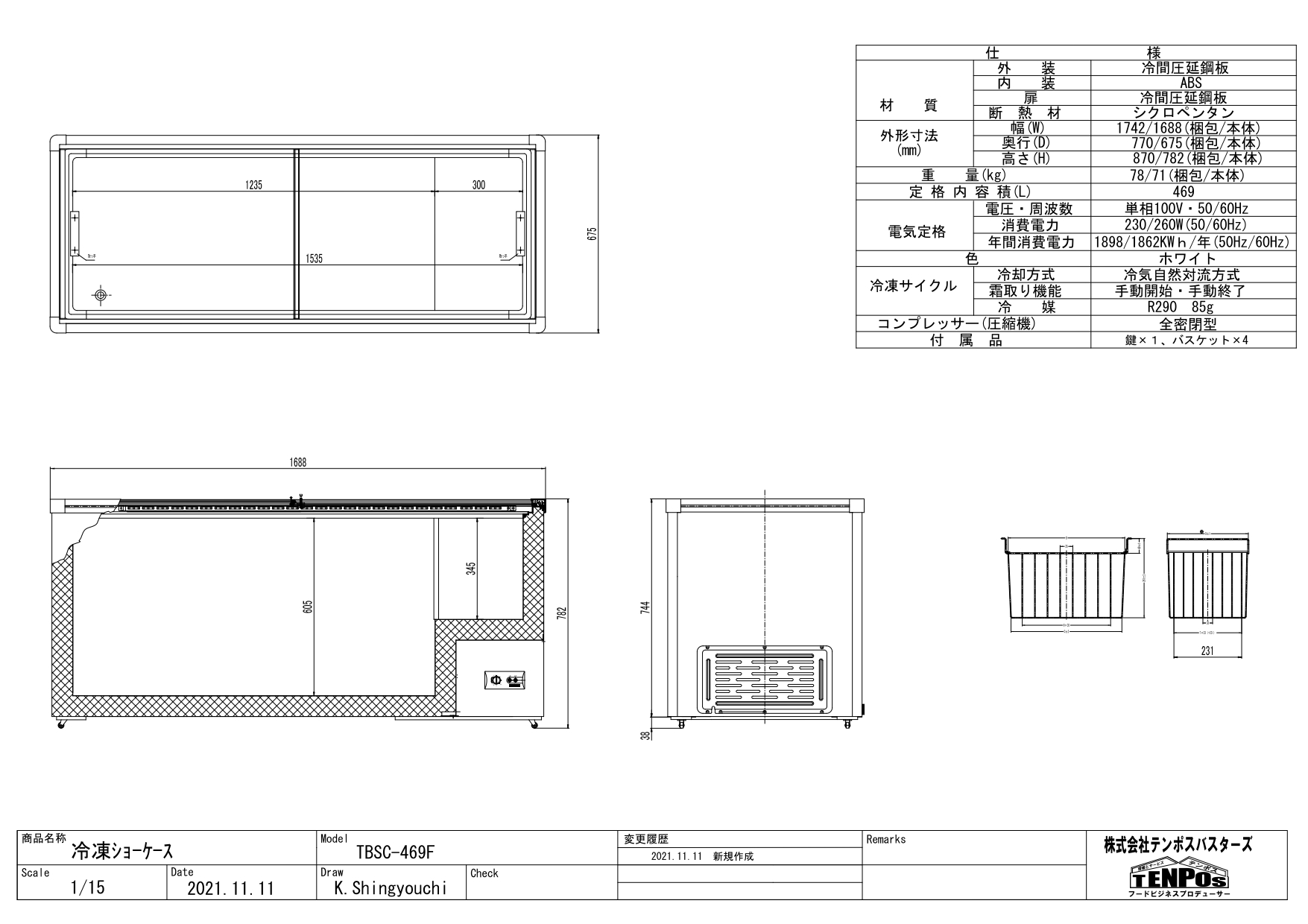 TBSC-469F 【テンポスオリジナル】冷凍ショーケース 平面ガラス扉 469L 幅1688×奥行675×高さ782(mm)【送料無料】