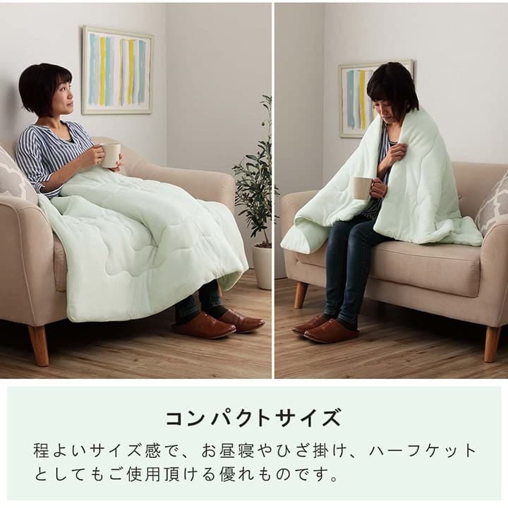 "中綿入りの肌掛け布団になります。側生地には肌触りのよりタオル生地を使用しています。コンパクトに持ち運びラクラクいろいろなところで活躍するサイズ感。ひざ掛け、ハーフケットとしてもご使用いただけます。