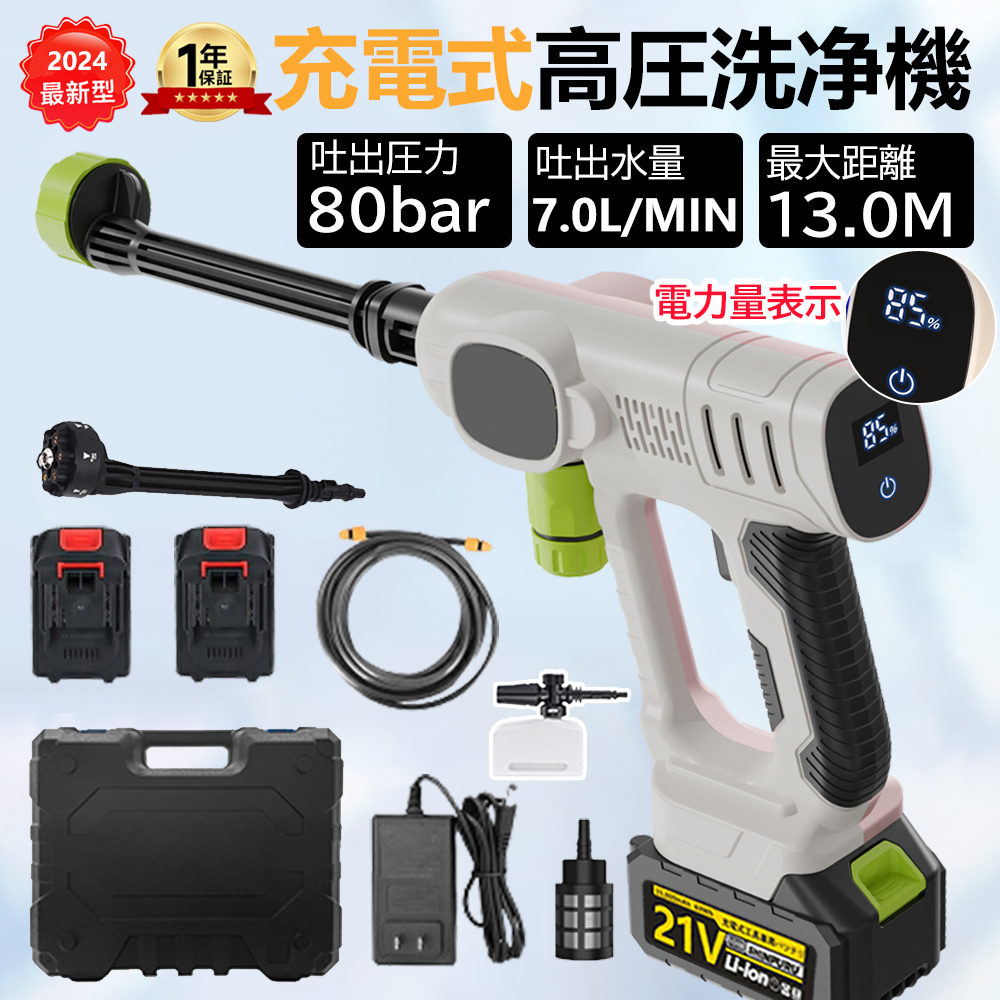 高圧洗浄機本体は約:1.5kg(本体、バッテリー、アクセサリーを含む)小さくて軽いので、女性にも扱いやすい。