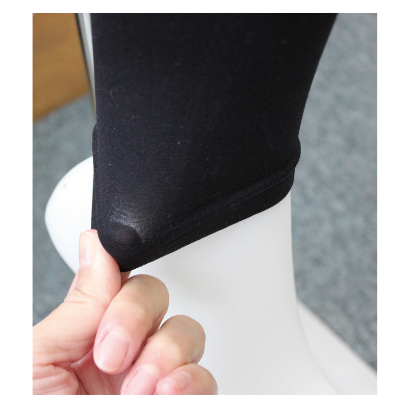 幅広のストレッチ編みによって面で支えるので、ウエストをしめつけにくい。
