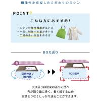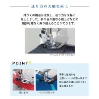 自動糸切り機能、下糸クイックセット機能、BOX送り機構、縫い模様20種類、大型液晶パネル、広いソーイングスペース、自動ボタンホール(レバー式)、かんたん自動糸通し機能、7枚送り歯、針停止位置切替機能、ドロップフィード、LEDライト、電源コードリール式、ハードケース