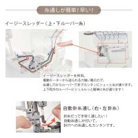 イージースレッダー(上・下ルーパー糸)、自動針糸通し(右・左針糸)、カンタン巻き縫い、マグネット針置き、広い針もとスペース、膝上げレバー、かがり幅微調整機構、静音設計、2本糸切り替え、差動送り調節