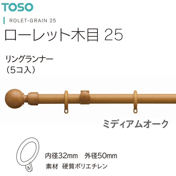 【アウトレット】トーソー カーテンレール ローレット木目25 部品 リングランナー(1袋5コ入)ミディアムオーク