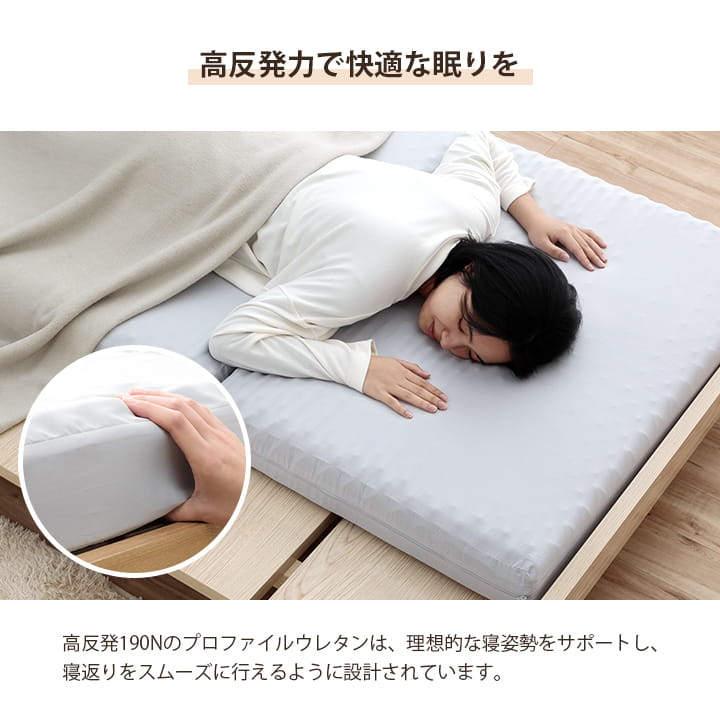| 【ベッド】 ■お部屋を広く見せるロースタイルベッド ■余白を生かしたワイドなサイズ感 ■ステージ部分はサイドテーブルとして活用可能 ■通気性抜群の設計 ■脚を外して使用することもできます ■安心の耐荷重200kg 【マットレス】 ■腰をやさしく支える高反発三つ折りマットレス ■体圧分散ができ、熱がこもりにくいプロファイルウレタン ■硬めの190N ■復元率98.5% ■安心の低ホルムアルデヒド ■厚み10cmで、1枚でも底付き感のない寝心地 ■コンパクト収納 ■取り外しやすいL字ファスナー付き洗えるカバー |