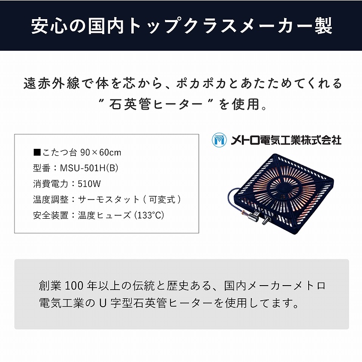 | 【台】 天板 メラミン化粧繊維版 脚 ラバーウッド材 ウレタン樹脂塗装仕上げ 【ヒーター】 U字型石英管ヒーター(510W) 電源スイッチ付きコード3m 温度ヒューズ、無段階温度調節機能 サーモスタット内蔵 |